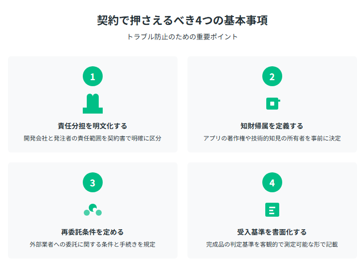 アプリ開発を外注する際、技術力や費用だけでなく契約内容の詳細も重要な検討要素です。トラブルを未然に防ぎ、円滑なプロジェクト進行を実現するために、以下の4つの基本事項を契約書で明確にしておきましょう。