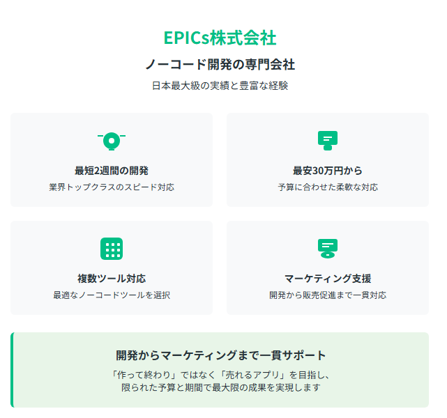 EPICs株式会社は、ノーコード開発において日本最大級の実績を誇る専門開発会社です。最安30万円、最短2週間という業界トップクラスのスピードと低コストでアプリ開発を実現。