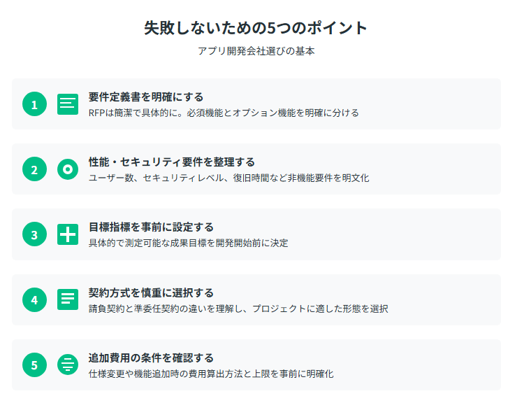 アプリ開発を外注する際、会社選びを間違えると予算オーバーや納期遅延といったトラブルに巻き込まれる可能性があります。原宿エリアには多様な開発会社がありますが、以下の5つのポイントを押さえて選定することが重要です。