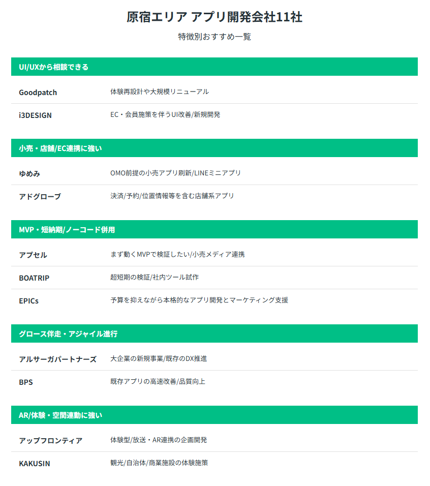 原宿・表参道エリアには、多様な強みを持つアプリ開発会社が集結しています。UI/UXデザインから本格的な開発まで、それぞれ異なる特色を活かしたサービスを提供。