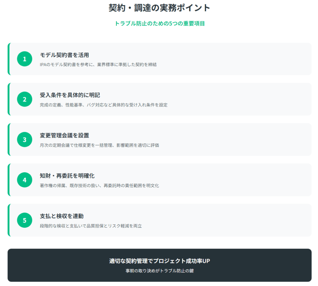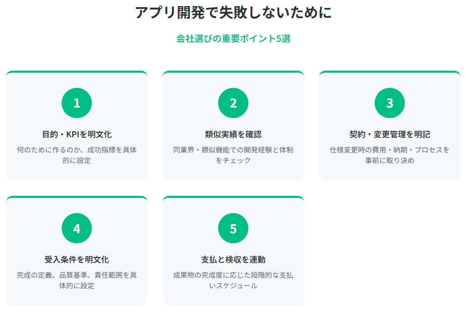 アプリ開発を成功に導くために、契約や調達の実務面で特に重要な5つのポイントをご紹介します。