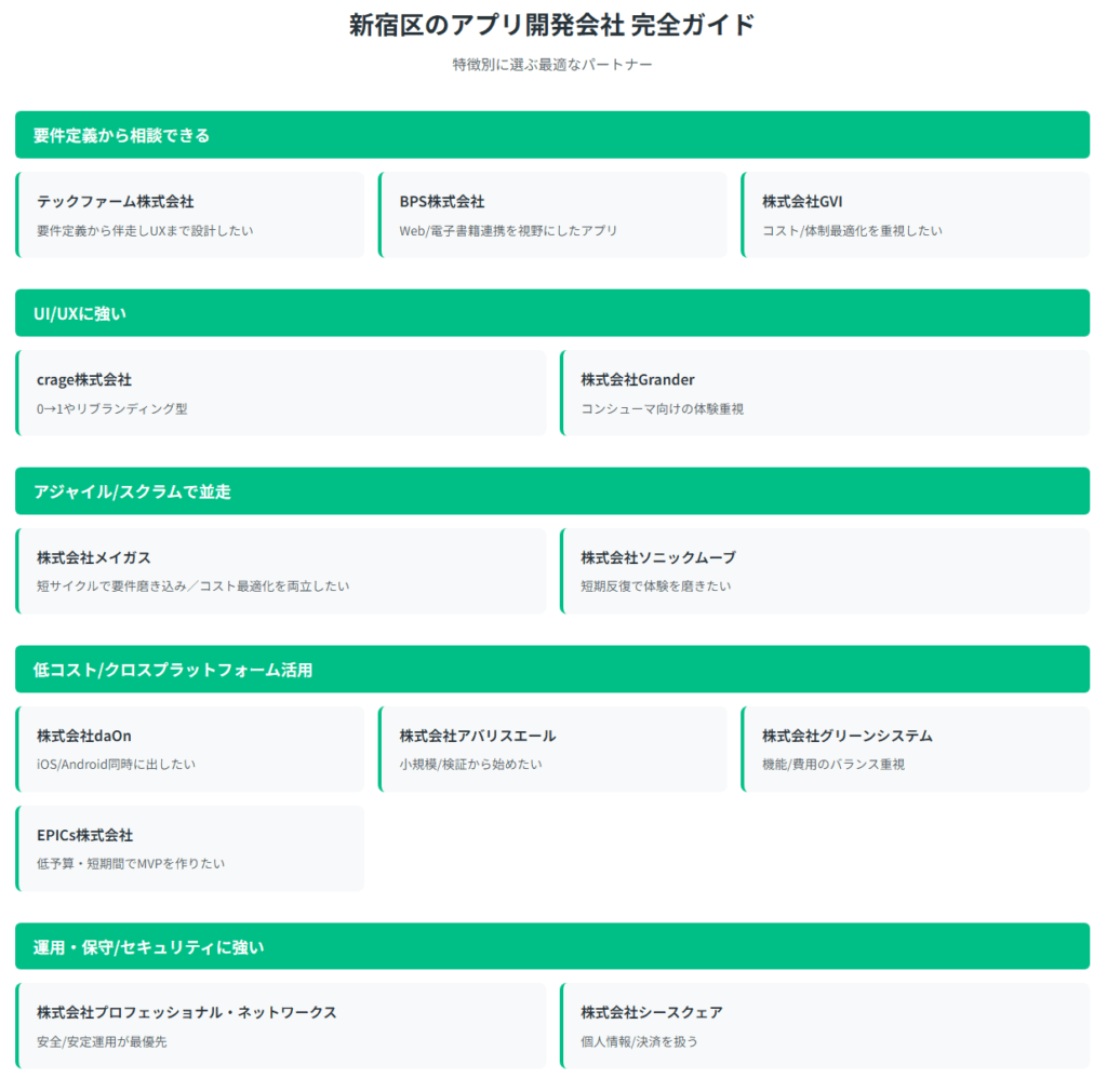 本記事では、新宿区を拠点とするアプリ開発会社を、それぞれの強みや特徴別に分類してご紹介。あなたのプロジェクトに最適なパートナー選びの参考にしてください。