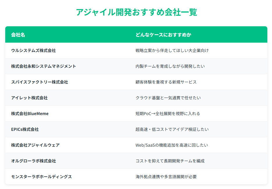 単に「アジャイル開発ができます」と謳っているだけでは不十分。あなたの業界や似た規模のプロジェクト経験があるかどうかを確認しましょう。