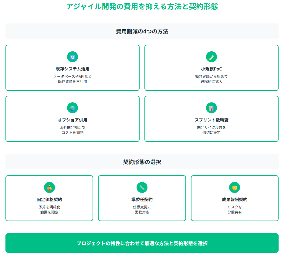 アジャイル開発を検討する際、多くの企業が気になるのが費用面です。ここでは、開発コストを効果的に抑える方法と、プロジェクトに適した契約形態の選び方をご紹介します。