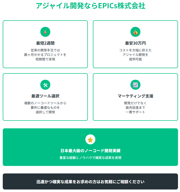 EPICs株式会社は、ノーコード開発(プログラミング知識がなくても開発できる手法)において日本最大級の実績を持つ開発会社です。