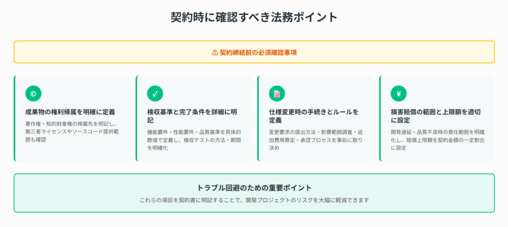 開発範囲、保守範囲、著作権、データの取り扱いなど、契約に関わる重要事項を事前に明確化しておくことが不可欠です。