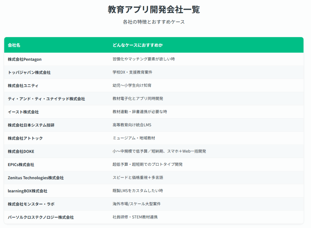 スピード重視でコストを抑えつつ、一定の品質を確保したい中小企業や、新規事業として教育アプリに参入する企業にとって、非常に頼りになるパートナーでしょう。