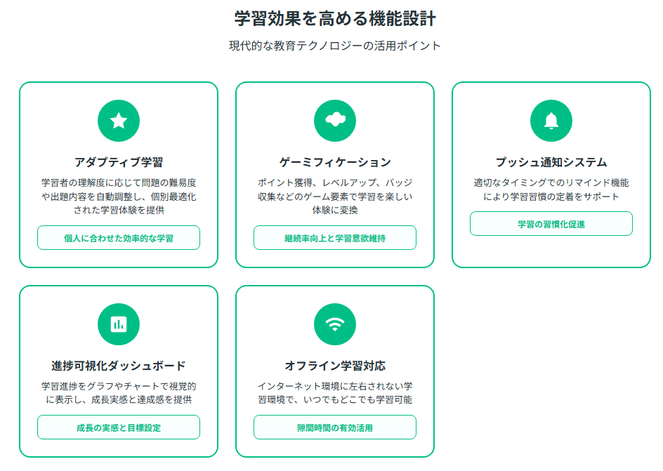 教育アプリの成功には、単なる情報提供を超えた学習効果の最大化が不可欠です。現代の教育テクノロジーを活用することで、従来の学習方法では実現できない個別最適化された学習体験を提供できます。