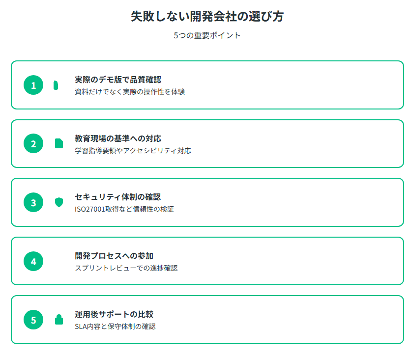 教育アプリ開発を外注する際、適切なパートナー選びが成功の鍵となります。以下の5つのポイントを押さえることで、失敗リスクを大幅に軽減できるでしょう。