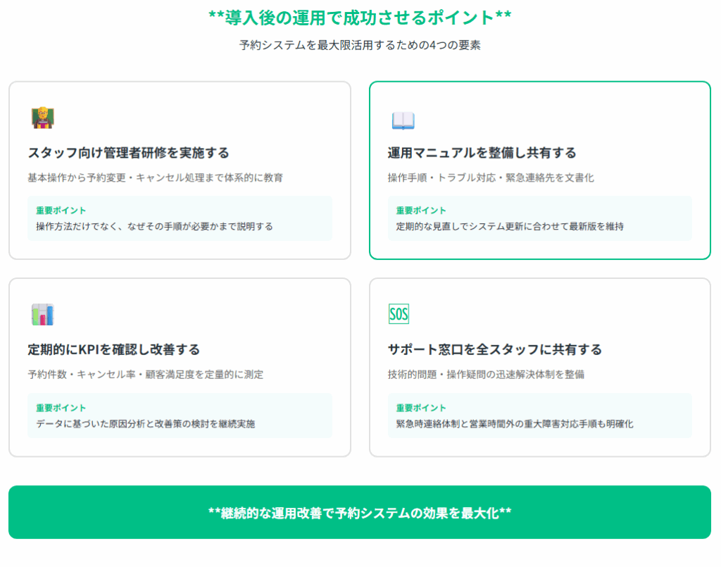 予約システムの導入が完了しても、それだけで業務効率化や売上向上が自動的に実現されるわけではありません。システムを最大限活用し、期待した成果を得るためには、導入後の運用体制をしっかりと整備することが重要です。