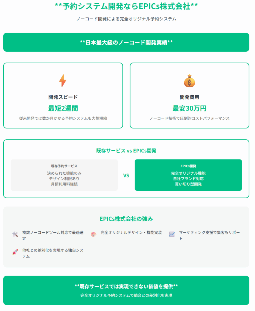 これまで10社の予約システム提供会社をご紹介してきましたが、既存のサービスでは実現できない完全オリジナルの予約システムをお求めの場合は、弊社EPICs株式会社にご相談ください。