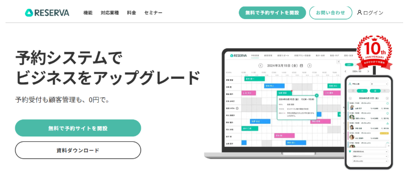 RESERVAは、ピラティススタジオから自治体まで7,000件を超える導入実績を持つ予約システムです。無料プランでは月70件の予約まで対応でき、有料プランも月3,520円からと非常にリーズナブルな価格設定となっています。