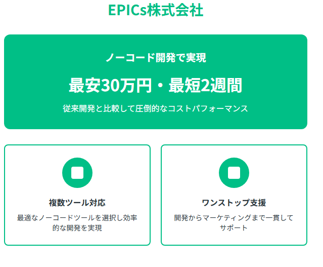 EPICs株式会社は、ノーコード開発において日本最大級の実績を持つ開発会社として、最安30万円・最短2週間という業界屈指のスピードと低コストでアプリ開発を提供しています。ノーコードとは、プログラミングコードを書かずにアプリケーションを構築する開発手法で、従来の開発と比較して大幅な時間短縮とコスト削減を実現できる技術です。
