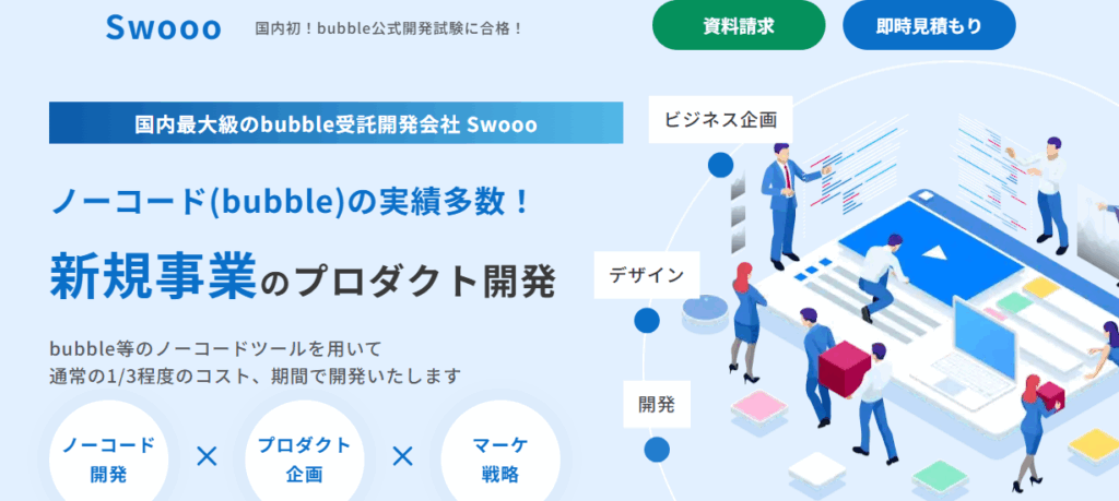 Bubbleとは、ドラッグ&ドロップの操作でWebアプリが作れるノーコードツールのことで、同社はこの分野で公式試験合格の実績を持つ専門家集団です。