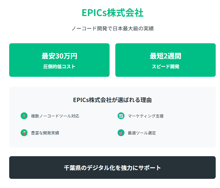 千葉県でのアプリ開発をお考えなら、ノーコード開発で日本最大級の実績を誇るEPICs株式会社にご相談ください。最安30万円、最短2週間という圧倒的なスピードと低コストでアプリ開発を実現します。