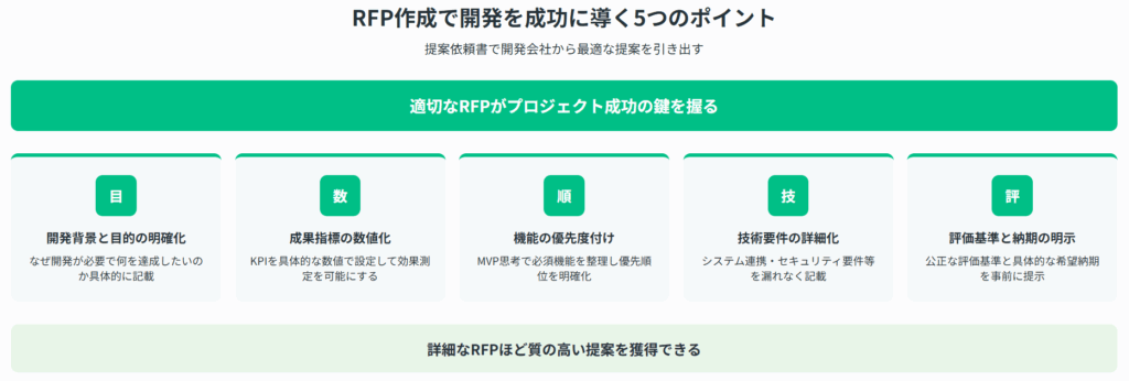 アプリ開発を外注する際、RFP(Request for Proposal:提案依頼書)の作成が成功の鍵を握ります。適切なRFPを作成することで、開発会社から具体的で比較しやすい提案を引き出すことが可能です。