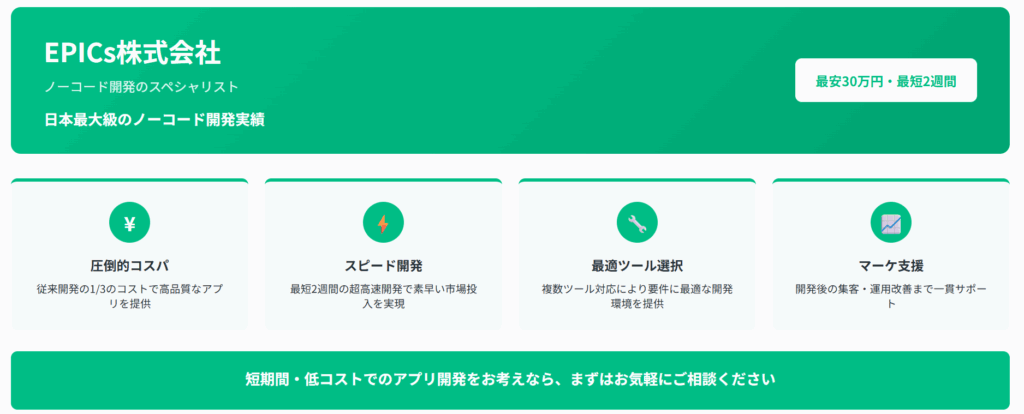 EPICs株式会社は、ノーコード開発において日本最大級の実績を持つ専門開発会社です。