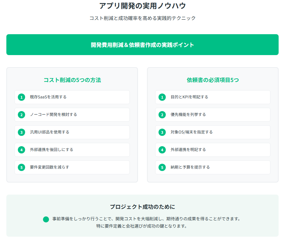 アプリ開発を成功させるためには、会社選び以外にも重要なポイントがあります。開発費用を効果的に削減する方法や、開発会社への依頼書類を適切に準備することで、プロジェクトの成功確率を大幅に向上させることが可能です。