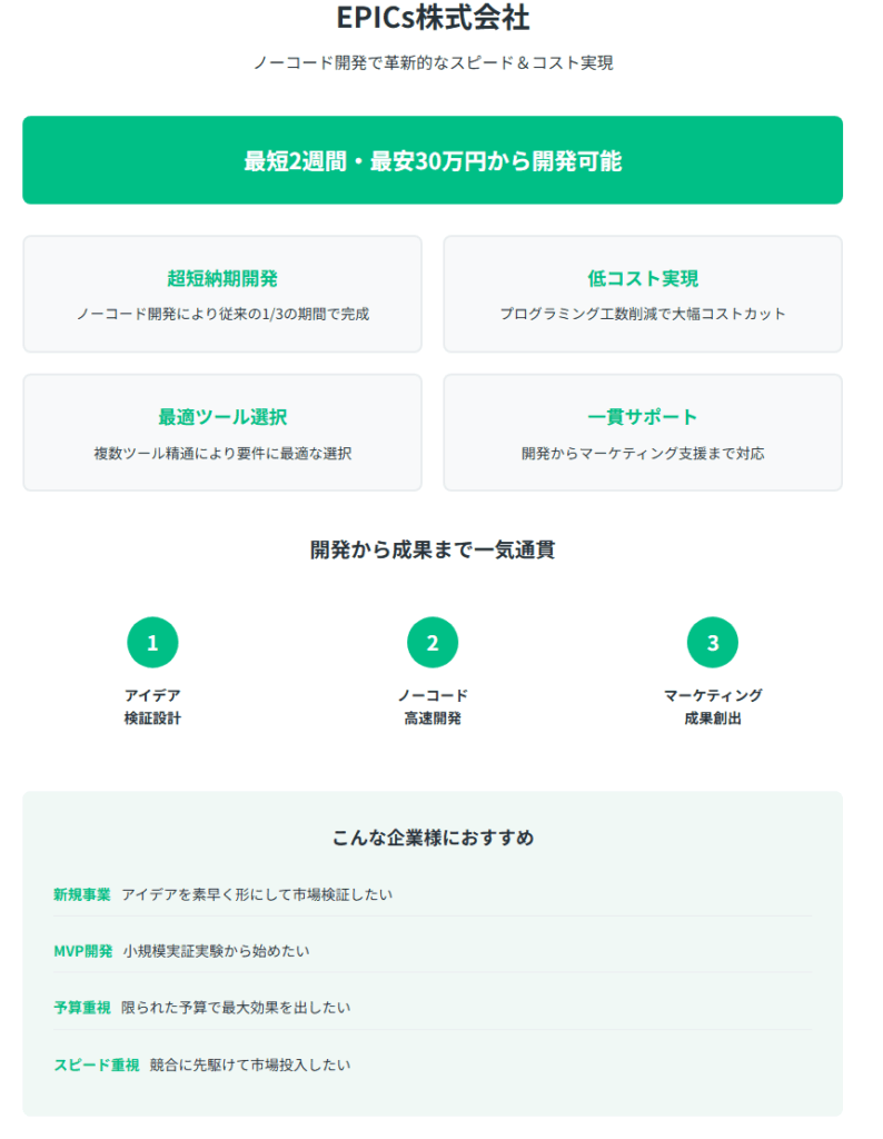 最短2週間、最安30万円からという条件は、新しいアイデアを素早く形にして市場で検証したい企業様にとって大きなメリット。