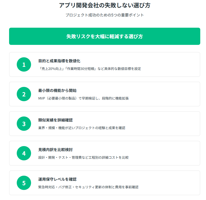 アプリ開発プロジェクトを成功に導くためには、技術力だけでなく、プロジェクト管理や運用面まで含めた総合的な視点での会社選びが重要です。特に初めてアプリ開発を外注する場合は、以下の5つのポイントを押さえることで、失敗リスクを大幅に軽減できます。