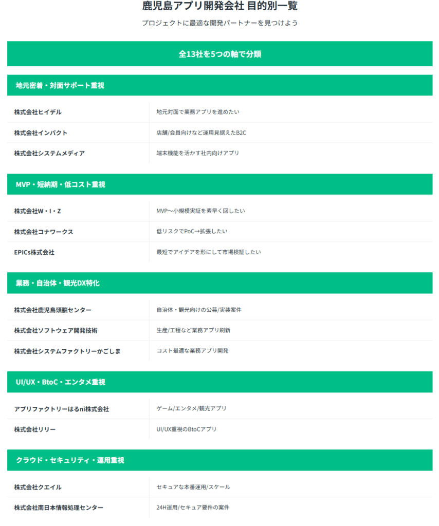 本記事では、鹿児島県内の主要なアプリ開発会社12社を、5つの軸で分類してご紹介。それぞれの会社の特徴や強み、どのような案件におすすめかを詳しく解説していきます。
