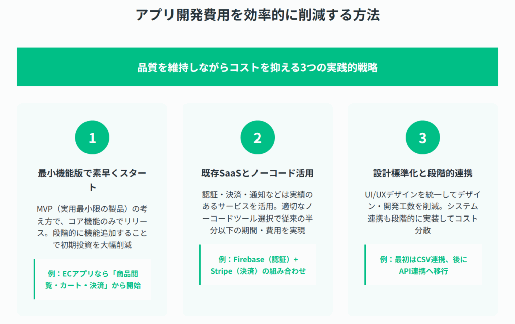 開発コストを効率的に削減しながら、質の高いアプリケーションを実現するための具体的な手法をご紹介します。以下5つの手法を組み合わせることで、大幅なコスト削減が期待できます。