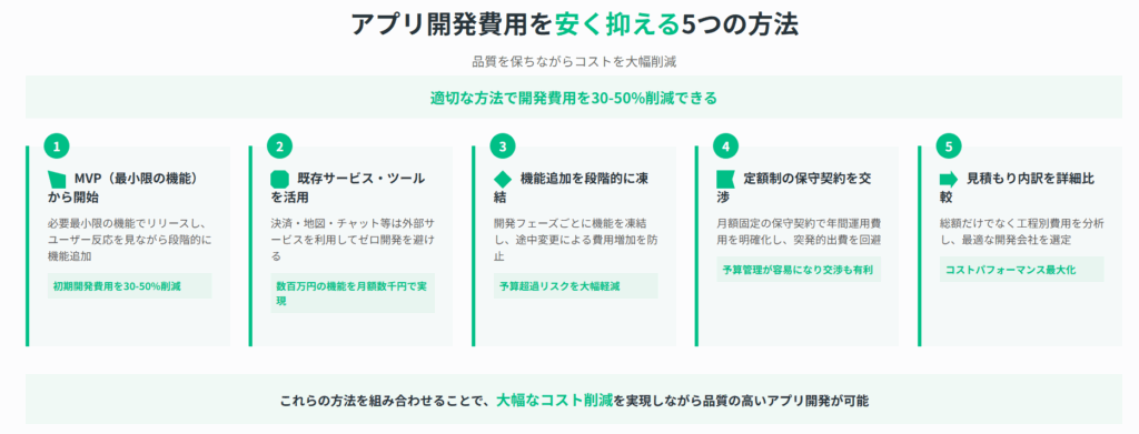 アプリ開発では、機能を盛り込みすぎて予算が膨らんでしまうケースが少なくありません。しかし、適切な方法を取れば、品質を保ちながら開発費用を大幅に削減することが可能です。以下の5つの方法を活用して、コストパフォーマンスの高いアプリ開発を実現しましょう。