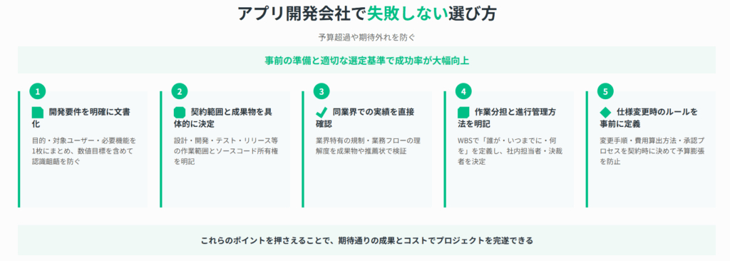 長野県でアプリ開発会社を選ぶ際、「思っていた仕上がりと違う」「予算が大幅に超過した」といった失敗を避けるためには、事前の準備と適切な選定基準が重要です。以下の5つのポイントを押さえることで、あなたのプロジェクトに最適なパートナーを見つけることができます。