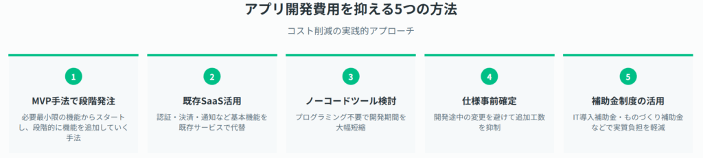 アプリ開発の予算を最小限に抑えながらも、必要な機能を実現するための実践的な手法をご紹介します。以下5つのアプローチを組み合わせることで、大幅なコスト削減が期待できます。