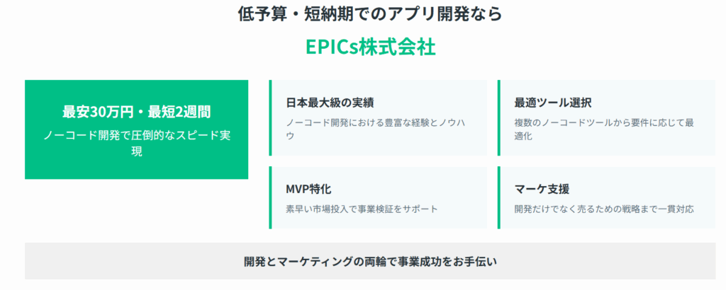 EPICs株式会社は、ノーコード開発において日本最大級の実績を持つ開発会社です。最安30万円、最短2週間という圧倒的なスピードとコストパフォーマンスで、従来の開発手法では実現困難な短納期・低予算でのアプリ開発を可能にしています。