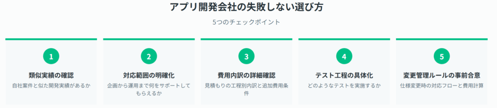 アプリ開発で失敗しないためには、技術力だけでなく様々な観点から開発会社を評価することが重要です。以下5つのポイントを確認しましょう。