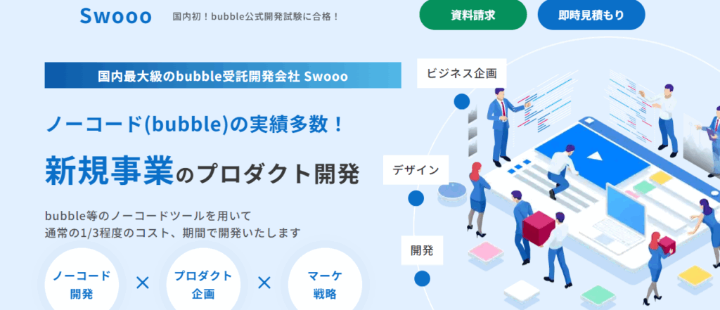 Swooは、ノーコード開発プラットフォーム「Bubble」を中心とした受託開発に特化した会社です。