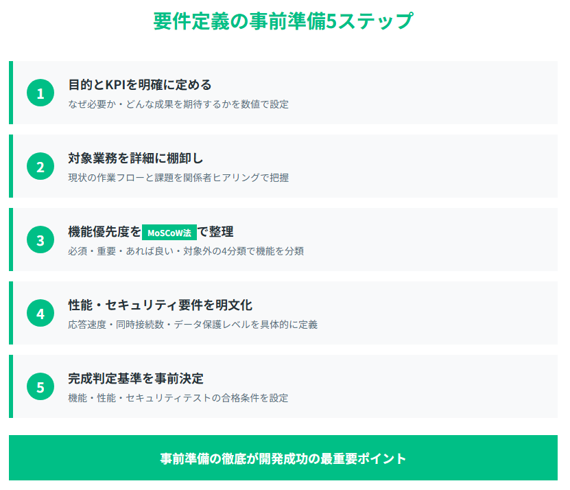 アプリ開発を成功させるためには、開発会社選びと同様に、事前の要件定義も重要な要素です。以下の5つのステップを踏むことで、開発会社との認識のズレを防ぎ、スムーズなプロジェクト進行が可能になります。