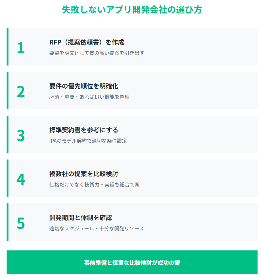 和歌山でアプリ開発を成功させるためには、適切なパートナー選びが不可欠です。以下の5つのポイントを押さえることで、自社に最適な開発会社を見つけることができます。