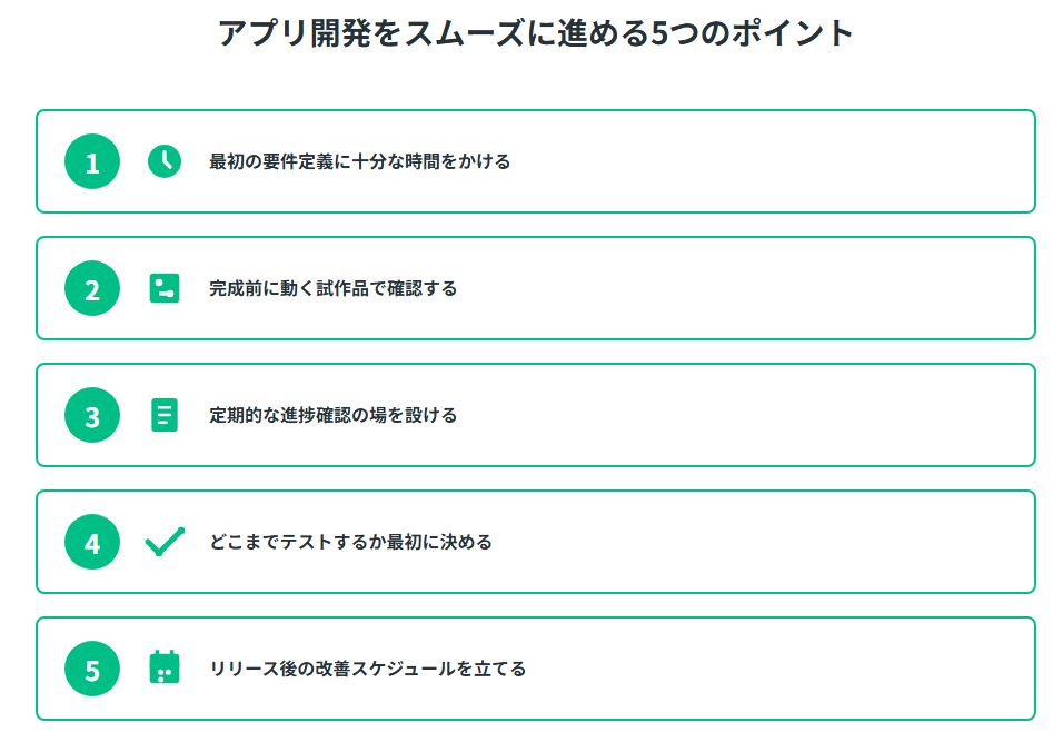 開発会社を選んだ後、実際のプロジェクトを成功させるためには、開発プロセスの各段階で押さえるべきポイントがあります。ここでは、アプリ開発をスムーズに進めるための重要なポイントを5つご紹介します。