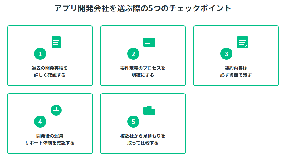 長崎でアプリ開発会社を選ぶ際、何を基準に判断すればよいのか迷う方は多いでしょう。開発会社選びを間違えると、予算オーバーやスケジュール遅延、期待していた機能が実装されないといった失敗につながりかねません。ここでは、アプリ開発会社を選ぶ際に必ず確認すべき5つのポイントをご紹介します。