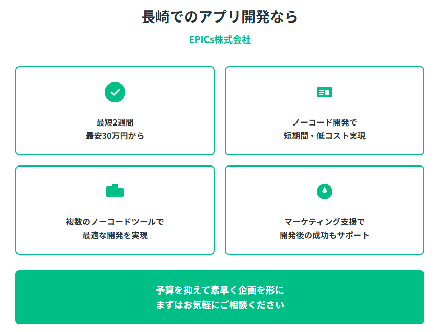長崎でアプリ開発をお考えなら、弊社EPICs株式会社にもぜひご相談ください。私たちは、ノーコード開発という手法で、従来の開発方法に比べて圧倒的に短期間・低コストでのアプリ開発を実現しています。