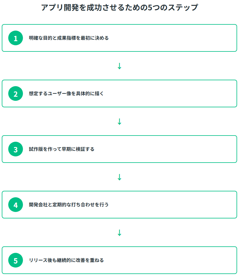開発会社を選んだ後、実際にプロジェクトを進める段階でも、成功のために押さえておくべきポイントがあります。せっかく良い開発会社と契約しても、進め方を間違えると期待した成果が得られないことも。ここでは、アプリ開発を成功に導くための具体的なステップをご紹介します。