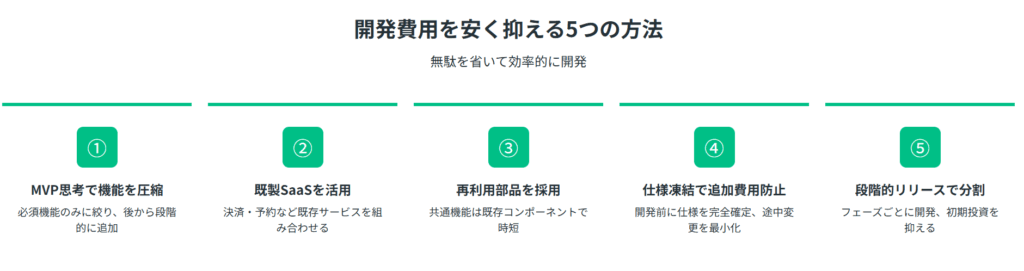 開発費用を抑える最も効果的な方法は、MVP(実用最小限の製品)の考え方で、本当に必要な機能だけに絞り込むことです。