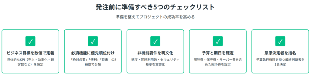 開発会社に依頼する前に自社で準備を整えておくことで、プロジェクトの成功率は格段に上がります。以下の5つのポイントを事前にクリアにしておきましょう。