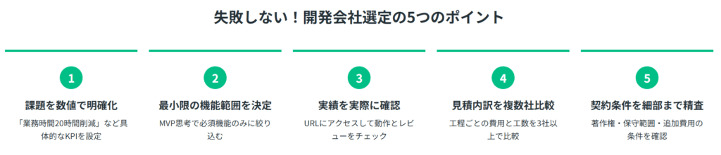 特に自社と似た業種や規模の開発事例があれば、優先的にチェックしましょう。