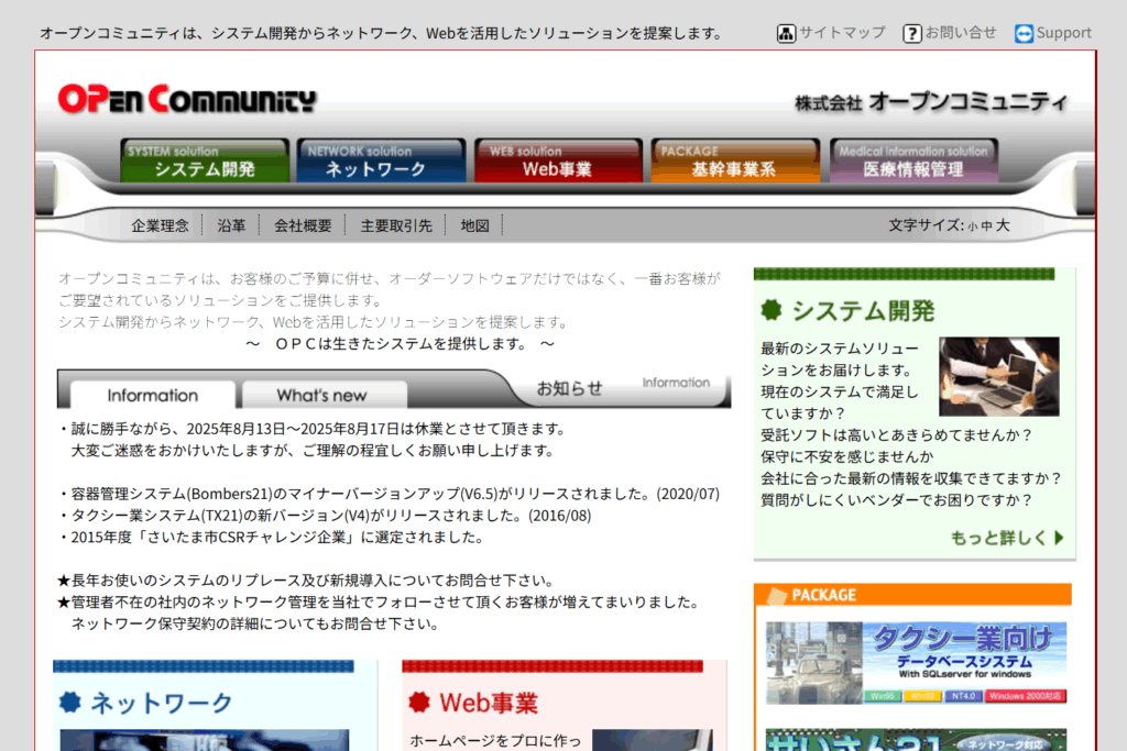 株式会社オープンコミュニティは、Webアプリケーションと業務システム開発を得意とする会社です。開発から保守運用まで一気通貫で対応できる体制が整っており、長期的なパートナーシップを築きやすい点が魅力となっています。製造業、印刷業、タクシー会社など、多様な業種での開発実績を持つ同社。