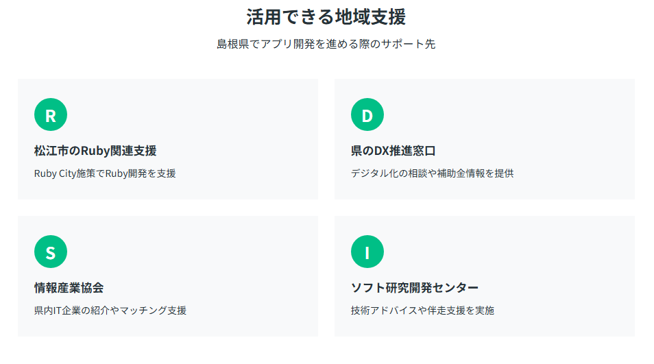 島根県でアプリ開発を検討する際、地域独自の支援制度や連携先を活用することで、よりスムーズにプロジェクトを進められます。ここでは、知っておくと役立つ4つの支援・相談先をご紹介。