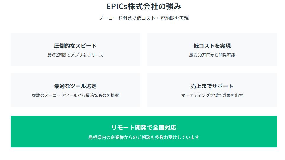 手前味噌で恐縮ですが、弊社EPICs株式会社をご紹介させてください。島根県外の企業ではありますが、リモート開発により全国からご依頼をいただいており、島根県内の企業様からのご相談にも対応可能です。