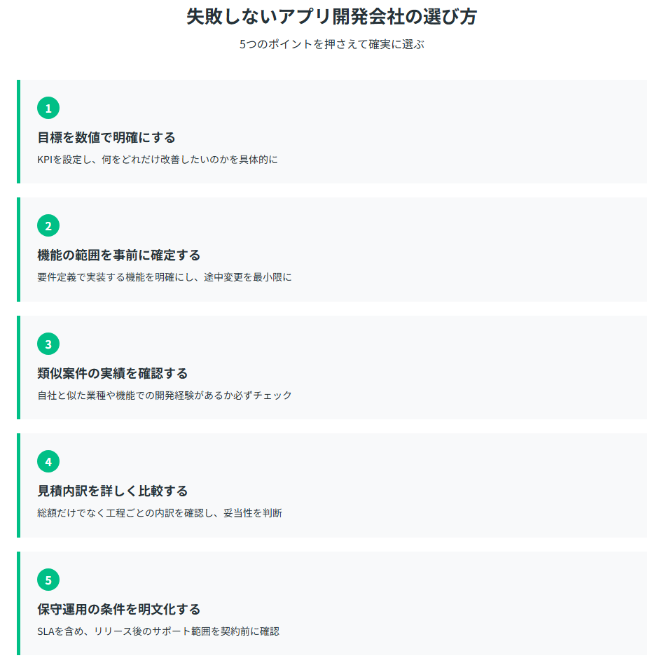 アプリ開発を外注する際、会社選びを間違えると予算オーバーや納期遅延、期待した成果が得られないといった失敗につながります。ここでは、開発会社を選ぶ際に確認すべき5つのポイントをご紹介。