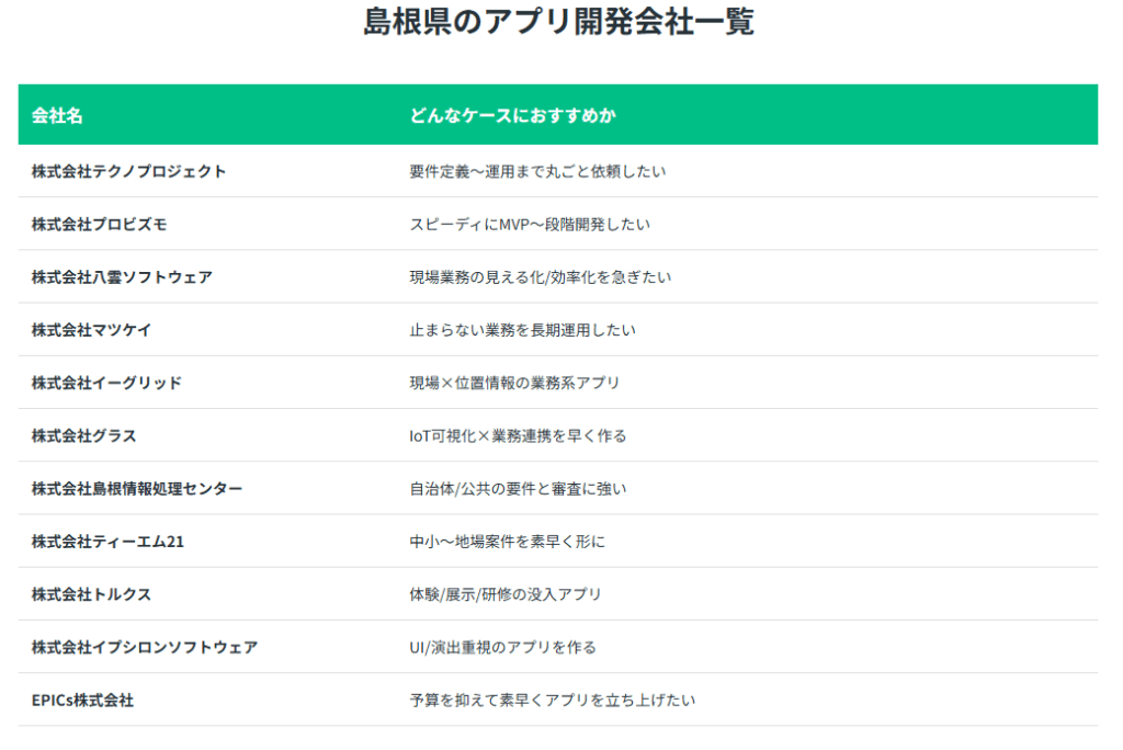 本記事では、島根県内の主要なアプリ開発会社10社を、「要件定義から相談できる」「業務改善・DXに強い」「Ruby/OSSに強い」「自治体・公共に強い」「モバイル・XRに強い」という5つの軸で分類。それぞれの会社の特徴や強み、どんなケースにおすすめかを詳しく解説します。