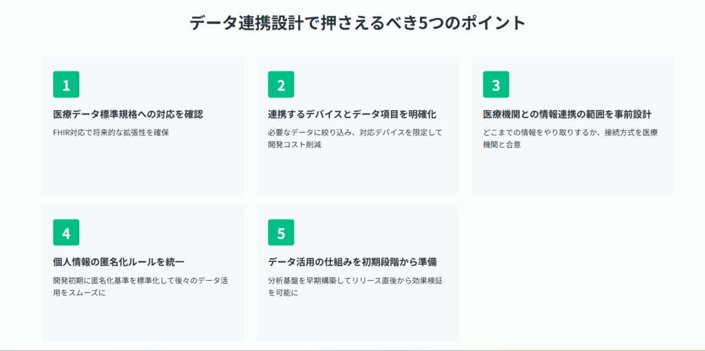 健康アプリでは、ウェアラブルデバイスや医療機関システムとのデータ連携が重要な機能となります。開発初期段階で以下の5つの設計ポイントを押さえることで、後々の仕様変更や追加開発を防げます。