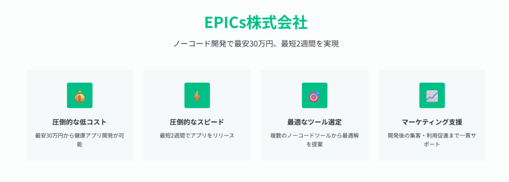 健康アプリの開発をご検討なら、ぜひEPICs株式会社にご相談ください。 弊社はノーコード開発において日本最大級の実績を持ち、最安30万円、最短2週間という圧倒的なスピードでアプリ開発を実現します。