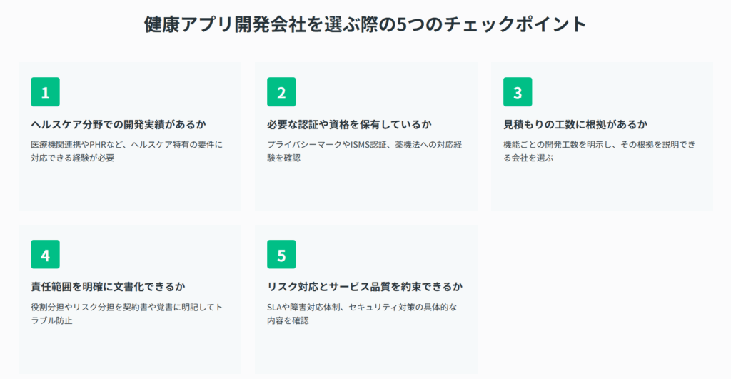 健康アプリの開発では、一般的なアプリとは異なる専門性や配慮が必要です。発注後のトラブルを避けるため、以下の5つのポイントを確認しましょう。