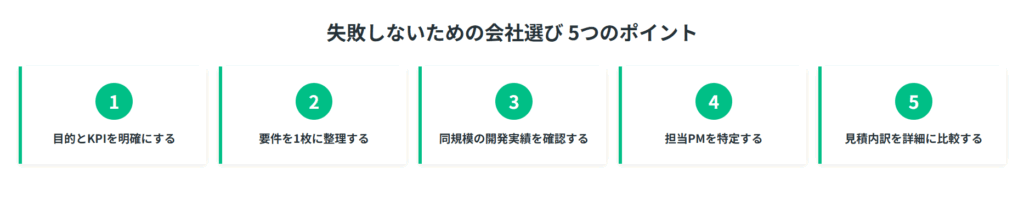 アプリ開発を外注する際、会社選びを誤ると予算超過や納期遅延、期待した機能が実装されないといったトラブルにつながります。ここでは、失敗を防ぐための5つのポイントを解説します。